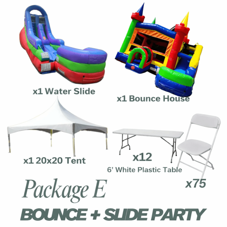 The perfect setup for larger backyard parties, school events, and summer celebrations. This package delivers shade, seating, and nonstop fun with both a bounce house and water slide.